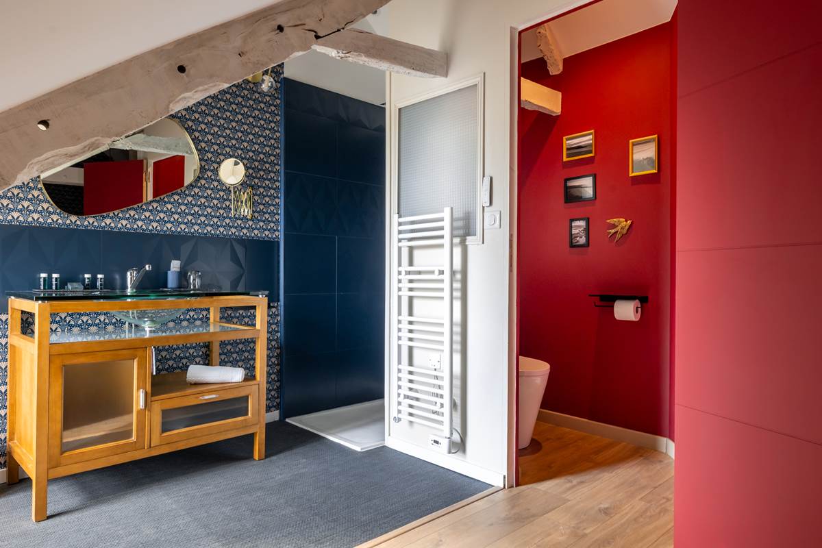 Située au 1er étage de la dépendance, avec un accès indépendant depuis la cour, la chambre L'Anse du Croc offre un cadre spacieux et intimiste. Elle est équipée d'un grand lit King size 180x200 (possibilité de lits jumeaux sur demande), d'un petit coin salon propice à la détente, ainsi que d'un plateau de courtoisie avec cafetière (éco-responsable sans capsules) et bouilloire. La chambre dispose également d'une salle de bain avec douche à l'italienne et de WC indépendants.